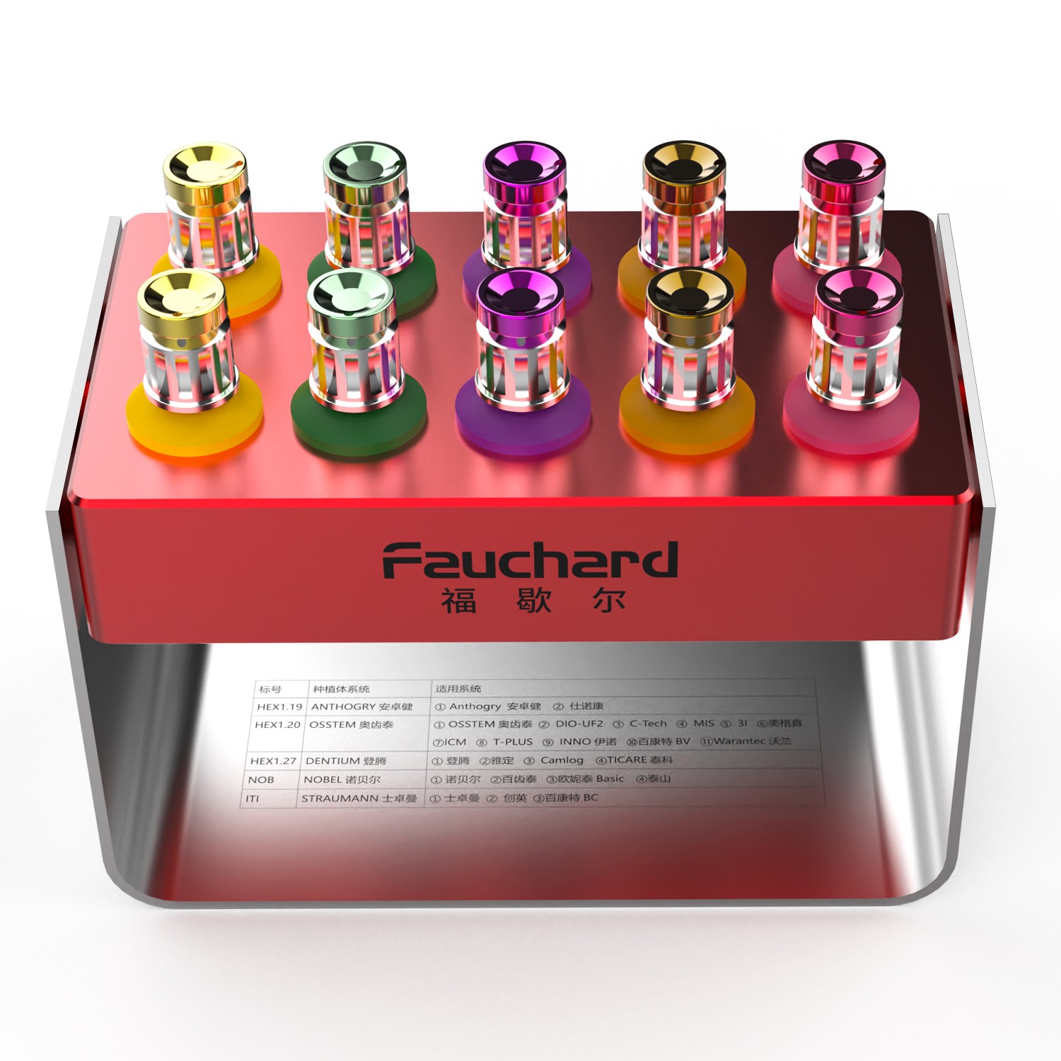 *不同型号搭配不同色彩且配备同色系硅胶插脚,一目了然避免使用混乱 *全铝合金耐高温消毒盒,医生可以反复132℃高温高压消毒使用